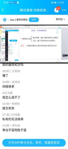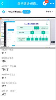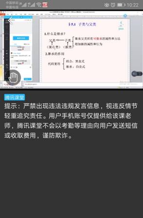 今天听计算机学院任晓莉老师的在线课程的感受:课堂讲解思路清晰,表达流畅,互动良好,偶尔有卡顿现象。通过听任老师的课,也亲身感受了学生在腾讯课堂app上课的感觉,我自己也在用腾讯课堂直播,为提高和完善自己课程各个环节的设计提供了灵感。