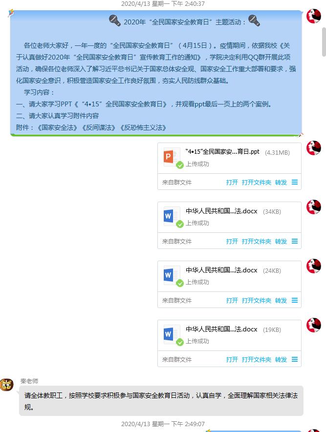 4月13日,疫情期间,必发集团welcome利用QQ群举办了关于全民国家安全教育日的主题活动,党总支书记秦少军担任主讲人,全院教职工参加了活动。