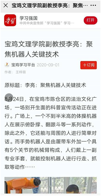 近日,我院副教授、陕西省机器人关键零部件重点实验室副主任李亮博士研发机器人关键技术,引起学习强国、陕西日报、陕西头条等多家媒体的广泛关注和报道。
