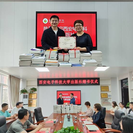 副院长王玮代表学院接收了西安电子科技大学出版社赠送的《机械创新设计与实践》、《机械动力学》等机械类专业图书240余册。院长王肖烨对西安电子科技大学出版社为学院赠书表示衷心感谢,并为对方颁发了捐赠证书。双方就教材建设、教材及图书出版分别做了详细交流。