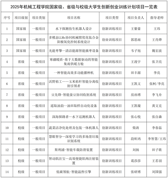 近日,教育部、省教育厅及学校正式公布了2025年大学生创新创业训练计划项目立项结果。我院共有14个项目获得立项,其中国家级项目3项、省级项目6项、校级5项,涵盖机器人技术、石油智能装备、农业机械等多个前沿与特色领域,展现了我院在跨学科创新与实践融合方面的持续突破。