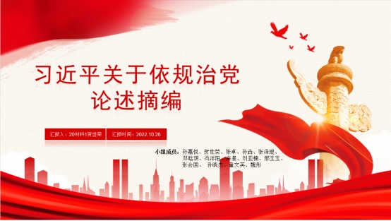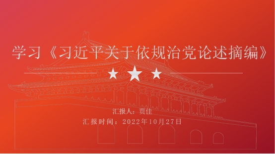 学生第二党支部理论学习第三小组汇报人贺世荣同志、第七小组汇报人贾佳同志围绕“《习近平关于依规治党论述摘编》”分别分享学习过程与成果。