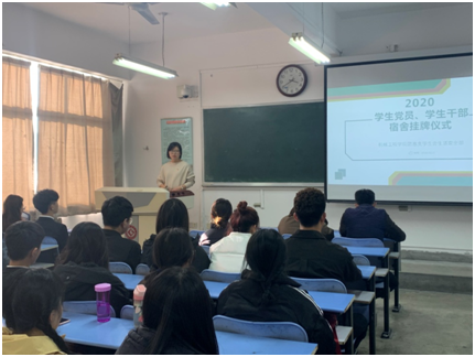 仪式中,辅导员刘萍表示,要充分发挥学生党员先锋岗、学生干部示范岗模范作用,积极调动全体学生自我管理、自我教育、自我服务意识,提高我院学生综合素质。同时也对学生干部和学生党员提出了希望和要求,勉励学生党员、学生干部以身作则,力争建设“考研”、“双创”、“红色”等学院特色寝室,推动我院学风建设迈向一个新阶段。学生干部代表张琳林、学生党员代表王旭江先后发言表示学生亮明身份,是对学生党员干部的激励和监督,今后会在工作学习中不忘初心、砥砺前行,在我院宿舍育人阵地发挥引领作用。
