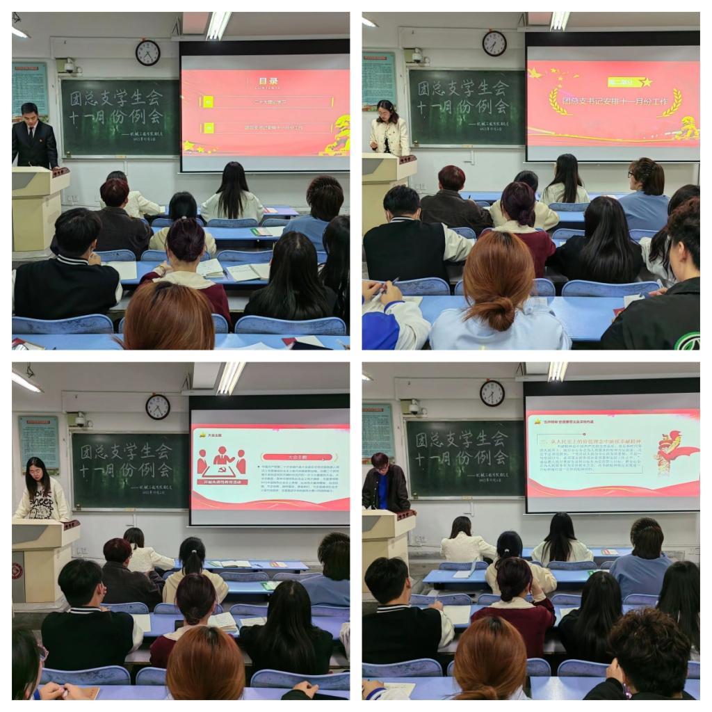 会议第一项,团总支副书记贺欣带领全体成员学习了习近平总书记在中国共产党第二十次全国代表大会上的重要讲话内容。第二项,由部门负责人对本部门十月份工作进行总结,详细分析工作中存在的问题,提出可行性解决方案。最后,团总支书记屈子睿就十一月主要工作进行了安排,一是落实学院团员、青年开展“学习贯彻习近平新时代中国特色社会主义思想主题教育”的相关安排;二是响应校园科技节活动,积极组织好我院的相关活动,筹备参加校级辩论赛、最美笔记征集等比赛;三是做好篮球赛、羽毛球赛、奖助材料整理、学风建设等工作;四是加强对团总支、学生会新成员的培养,要讲政治,顾大局,注重文明礼貌和个人修养,打造一支有本领、能吃苦、肯奉献的学生干部队伍。