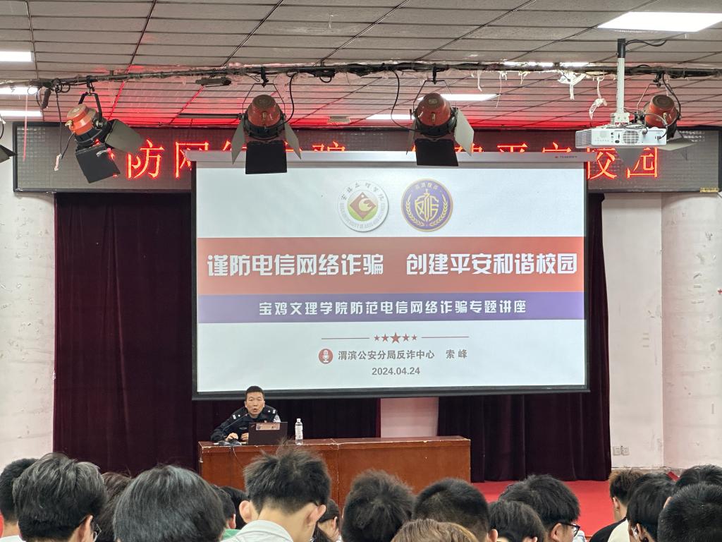 为进一步增强学生防范网络诈骗能力和抵御邪教侵蚀能力,创建平安校园,我院于2024年4月24日邀请渭滨公安分局反诈中心一级警长索峰、国保大队一级警长殷大军为学生做“谨防网络诈骗、邪教渗透·创建平安校园”的专题讲座,学院400余名学生参与本场讲座。