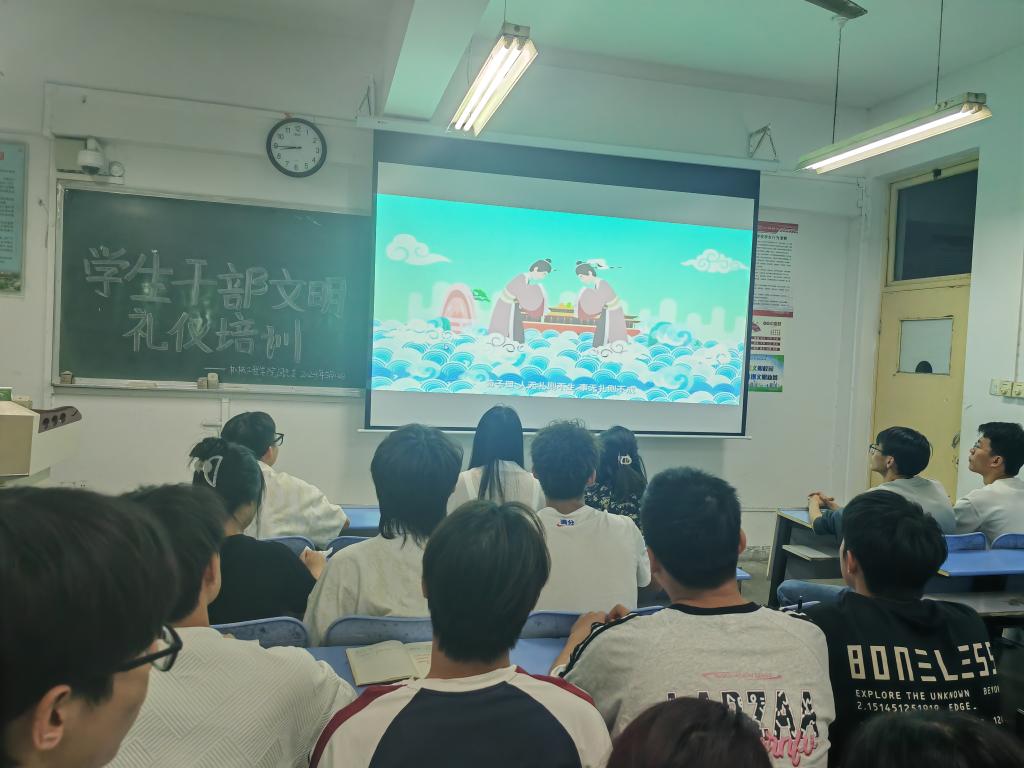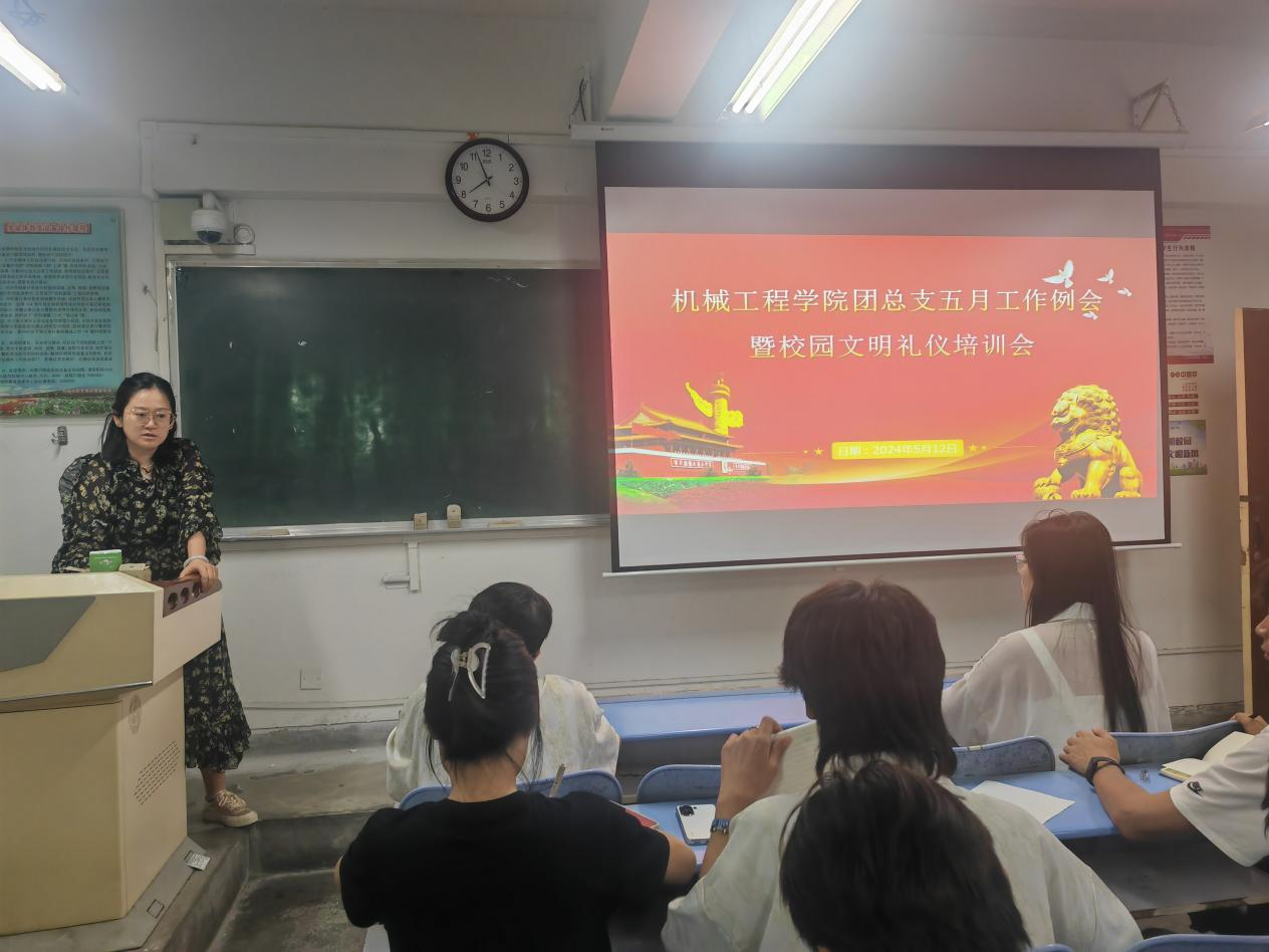 会议第一项,团总支书记屈子睿带领全体学生干部学习了习近平总书记五四青年节对广大青年的寄语,希望学生干部牢记习近平总书记的殷切嘱托,锐意进取、顽强拼搏,在新时代绽放出新的风采。随后,团总支、学生会各部门负责人汇报近期团学工作的筹备情况,屈子睿对相关工作进行指导和建议,指出团学工作是紧密围绕校、院中心工作,凝聚青年,组织青年,服务青年,必须切实做到“我为同学办实事”。最后,屈子睿对全体学生干部开展校园文明礼仪培训,强调文明礼仪对学生成长的重要意义,呼吁大家遵守文明礼仪,携手共创文明校园,争做文明校园的模范标杆。