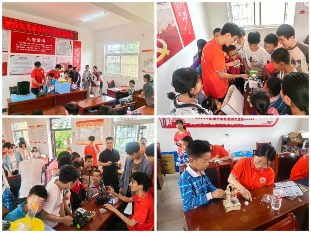 善作善成,特色课程助支教。团队充分发挥学院学科优势,开展“科学筑梦”特色支教活动,并结合学院的专业特色,准备了舞蹈机器人、四足机器狗、农业收割机、电磁炮等科创作品及离心现象、视觉暂留等物理实验,成员们以边看、边讲、边问、边学的方式引起孩子们浓烈的兴趣,积极参与交流互动。成员宋晨阳同学将离心现象物理实验巧妙地和孩子们的生活联系起来,引导孩子们正视自身,找到内心的支撑点,不被外界干扰所影响,勇敢地去寻找成长的正确方向。在制作科技手工环节,成员们不断引导孩子们自己动手尝试,点燃他们的科创热情,将科学的种子播进孩子们的心间。