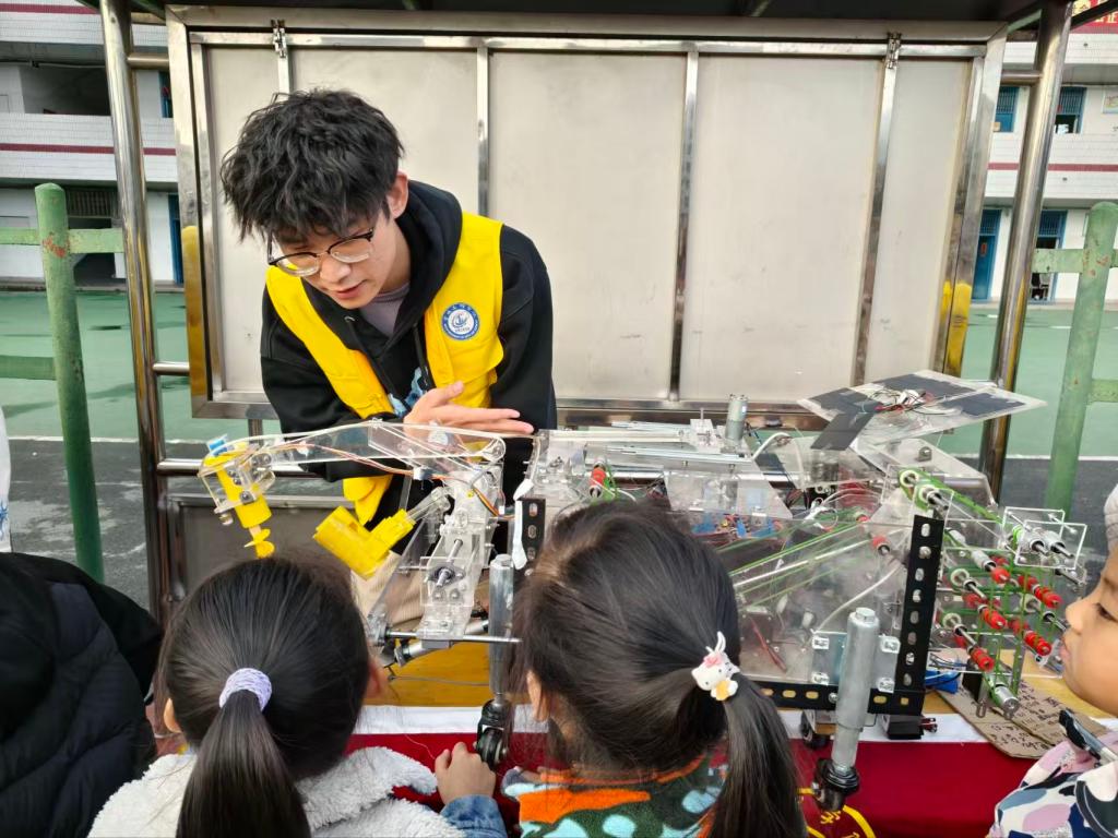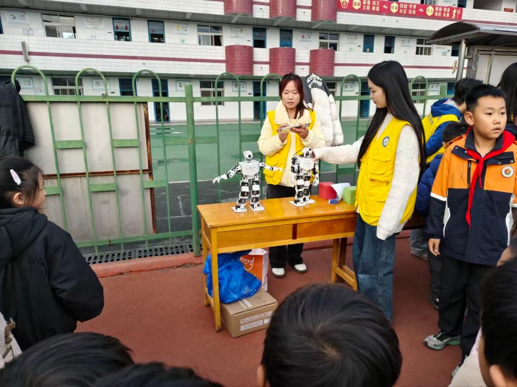 在科创作品参观环节,必发集团welcome大学生团队带来的舞蹈机器人、避障小车等科创成果惊艳亮相。随着机器人灵活舞动、避障小车精准穿梭,小学生们纷纷围拢上前,好奇地观察、提问,大学生团队耐心讲解原理并演示操作,现场互动氛围热烈而浓厚。