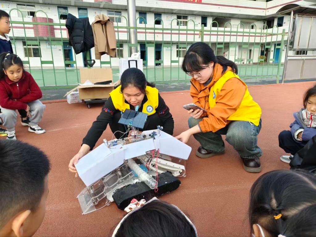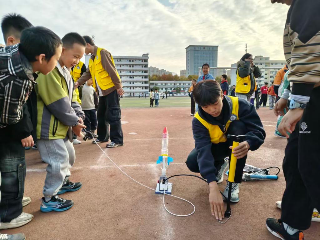 在分组实践环节,活动氛围更是推向高潮。室内手工制作区创意迸发,孩子们发挥想象搭建专属作品;烟雾炮、水火箭制作比拼现场则热闹非凡,大学生志愿者手把手指导小学生组装零件、调试参数。孩子们认真倾听、大胆尝试,在亲手操作中理解“反冲力”“气压原理”等科学知识,每完成一件作品,现场都响起阵阵欢呼,科学探索的乐趣在实践中充分彰显。